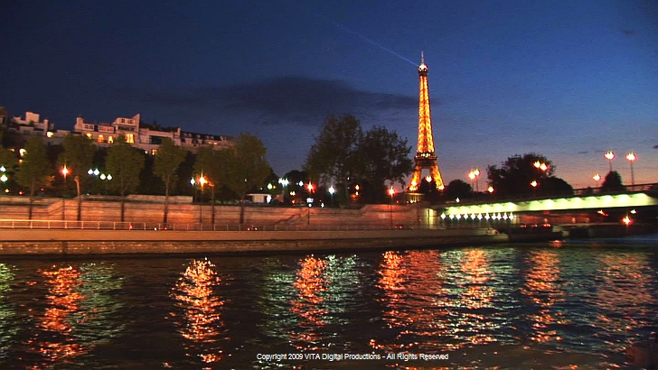 Further on the camera passes the beautiful glass boats, the Bateaux-Mouches.